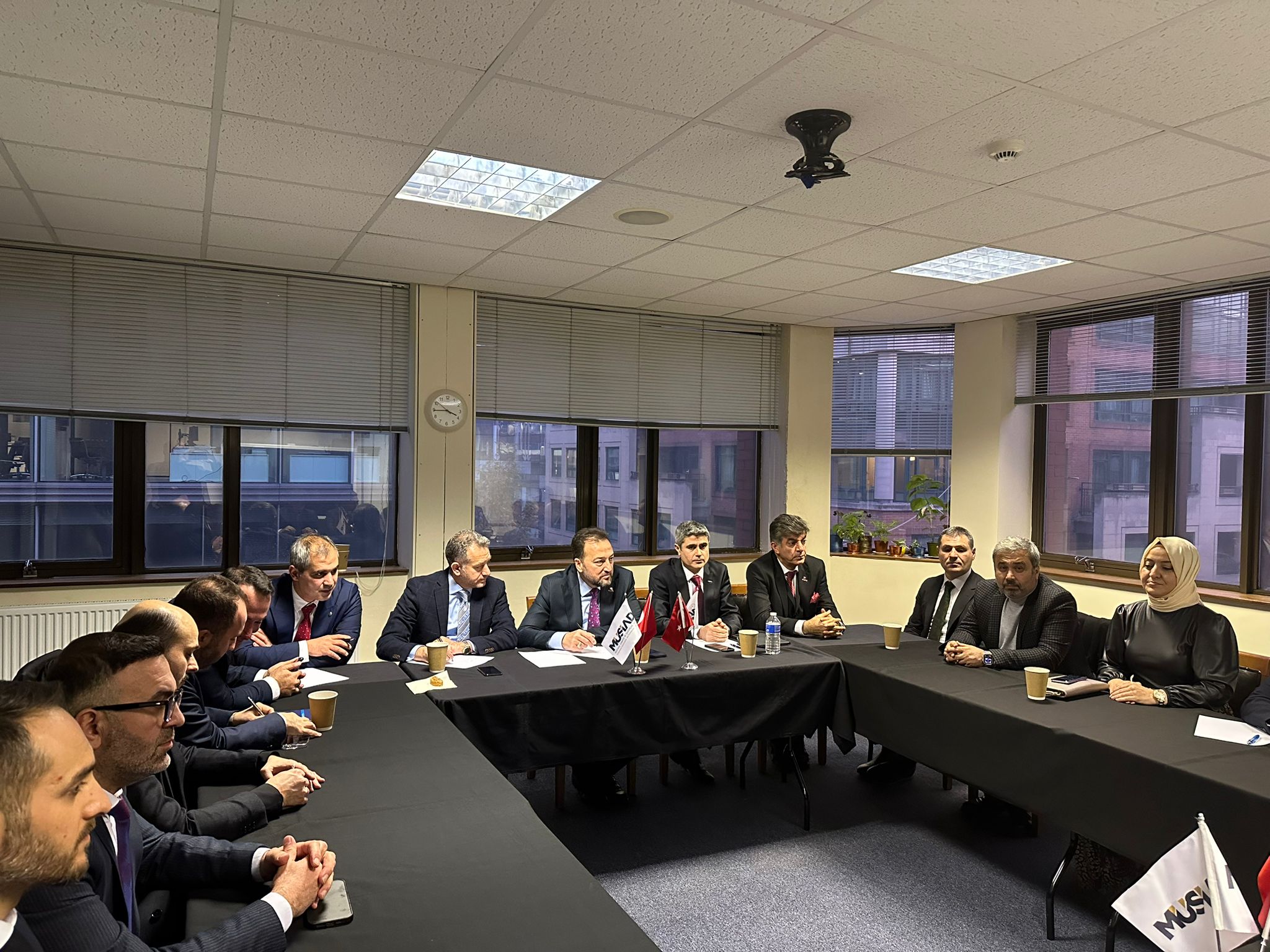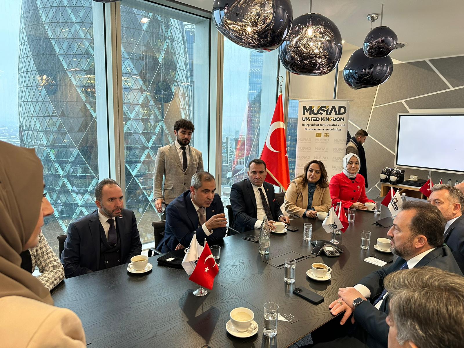 İngiltere programı çerçevesinde MÜSİAD İngiltere ofisini de ziyaret eden heyet, bölgesel ticaret fırsatlarına ilişkin sunumu dinlerken, iki ülke ticari ilişkilerinin güçlendirilmesi için atılabilecek adımları değerlendirdi.