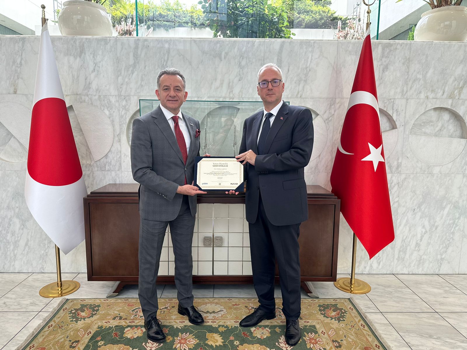 İkili ticari ilişkiler, iş birliği alanları ve bölgesel iş-yatırım fırsatlarının ele aldığı görüşmeler sonunda Japonyalı yetkililere Yetim Hamilik Sertifikası takdim edildi.