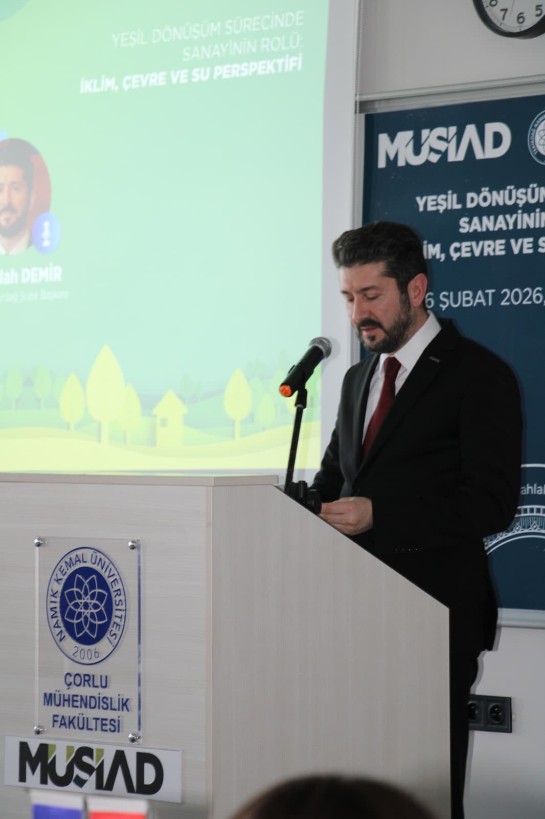 MÜSİAD Enerji ve Çevre Sektör Kurulu tarafından, Tekirdağ Şubesi iş birliğiyle Namık Kemal Üniversitesi Çorlu Mühendislik Fakültesinde “Yeşil Dönüşüm Sürecinde Sanayinin Rolü: İklim, Çevre ve Su Perspektifi” konulu program gerçekleştirildi.